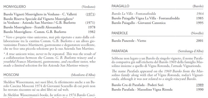 For the first time since Sheldon Wasserman first attempted it in 1991, we were starting to get a full picture of the history of Barolo bottlings. Organized by MGA (which is today's official name for a cru), Alessandro provides listings with dates and names of hundreds of different "cru" Barolos.